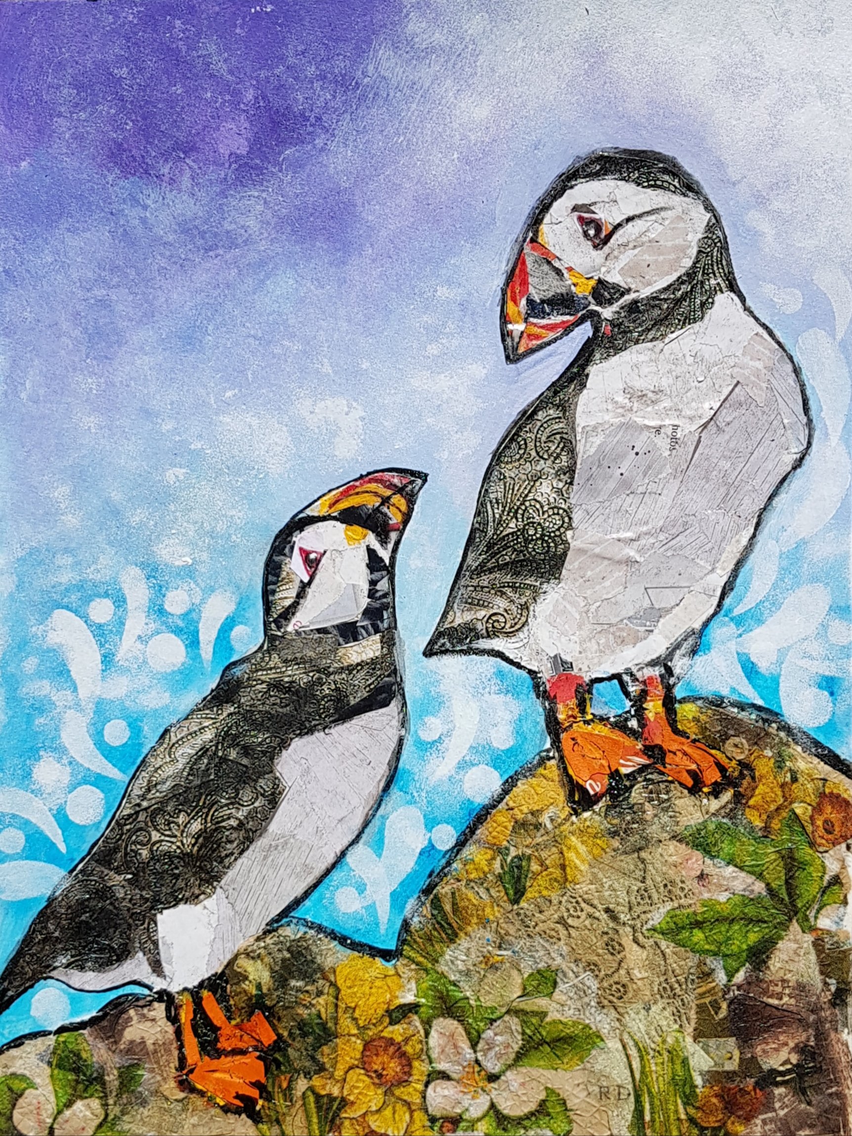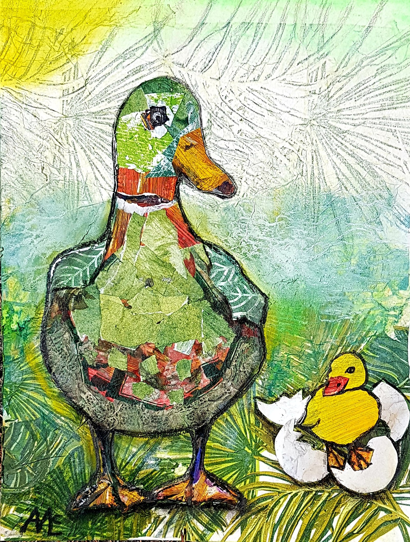 I present you today a little duck family in my collage collection of cute animals. I find the colours in animals so inspiring. I add my personal touch keeping my imagination going looking for bits of paper to match more or less the reference picture… I always end up with something quite different!