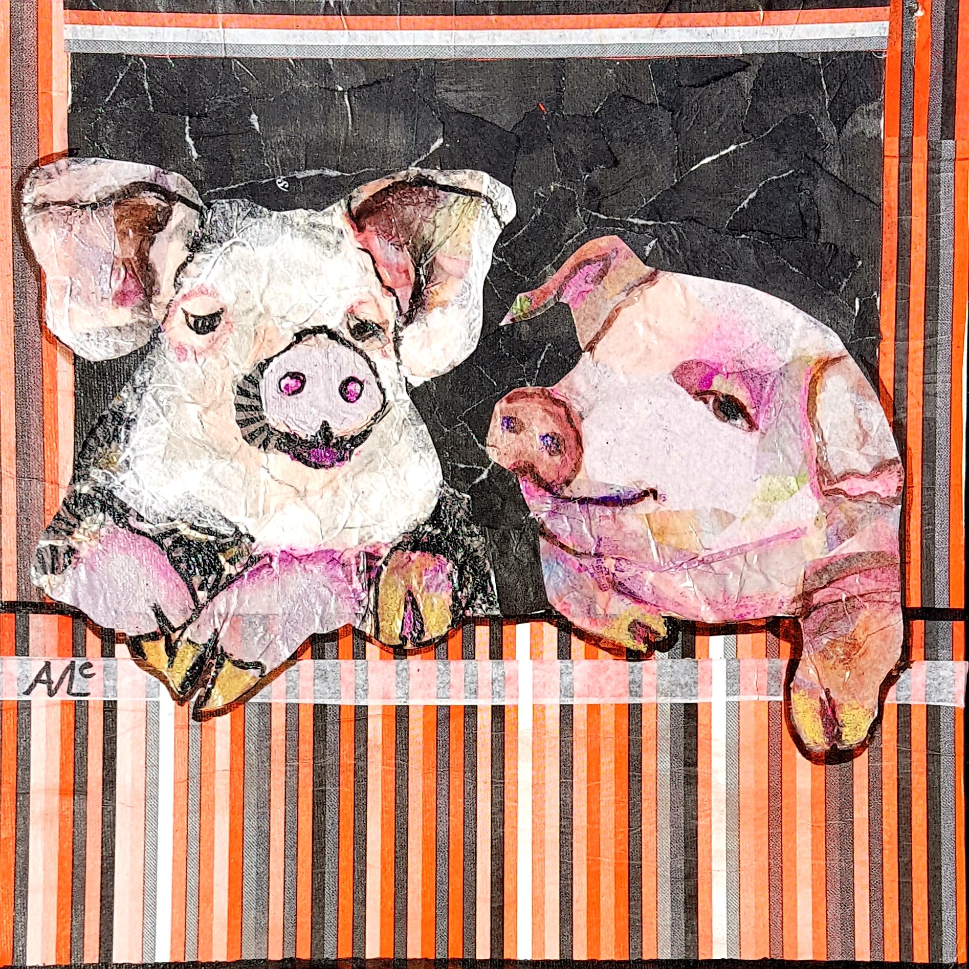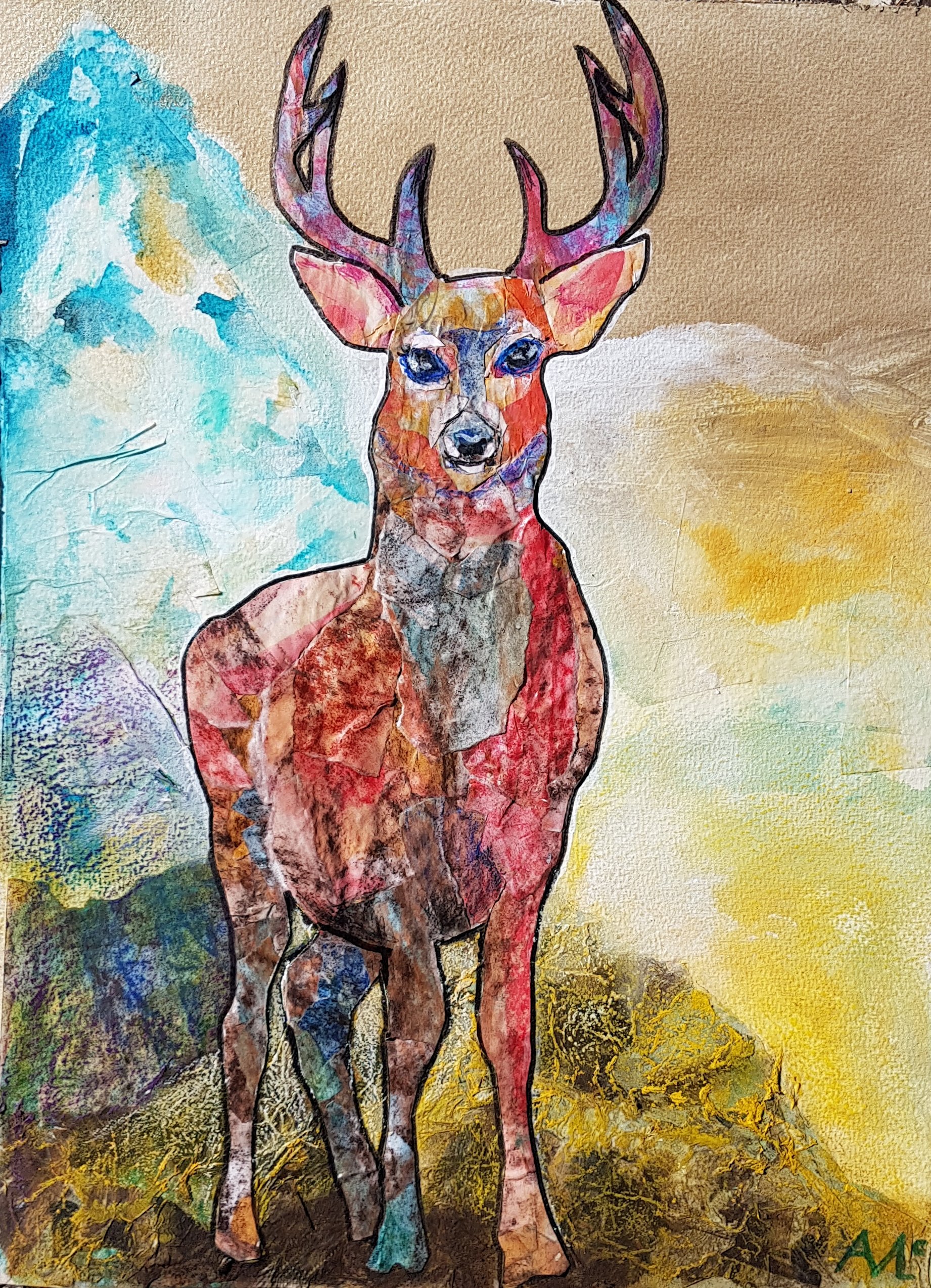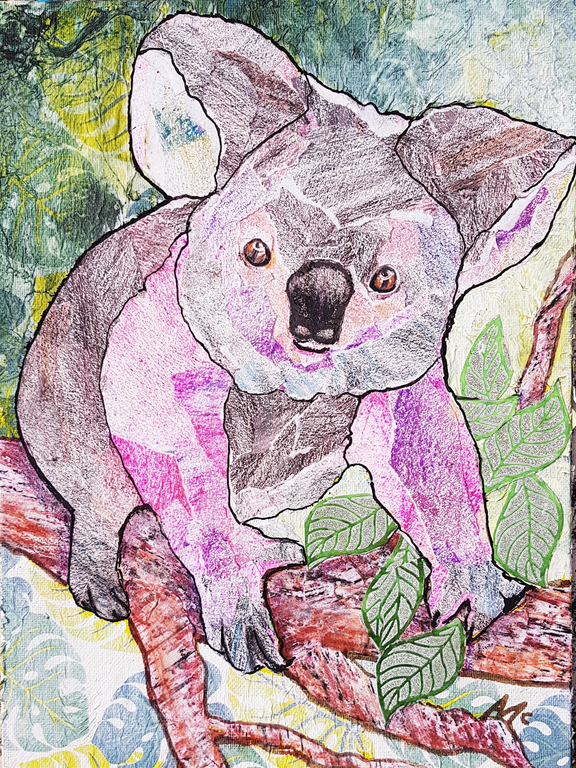 The squirrel was done with rice paper painted with different warm colours before being torn and applied to the canvas board.