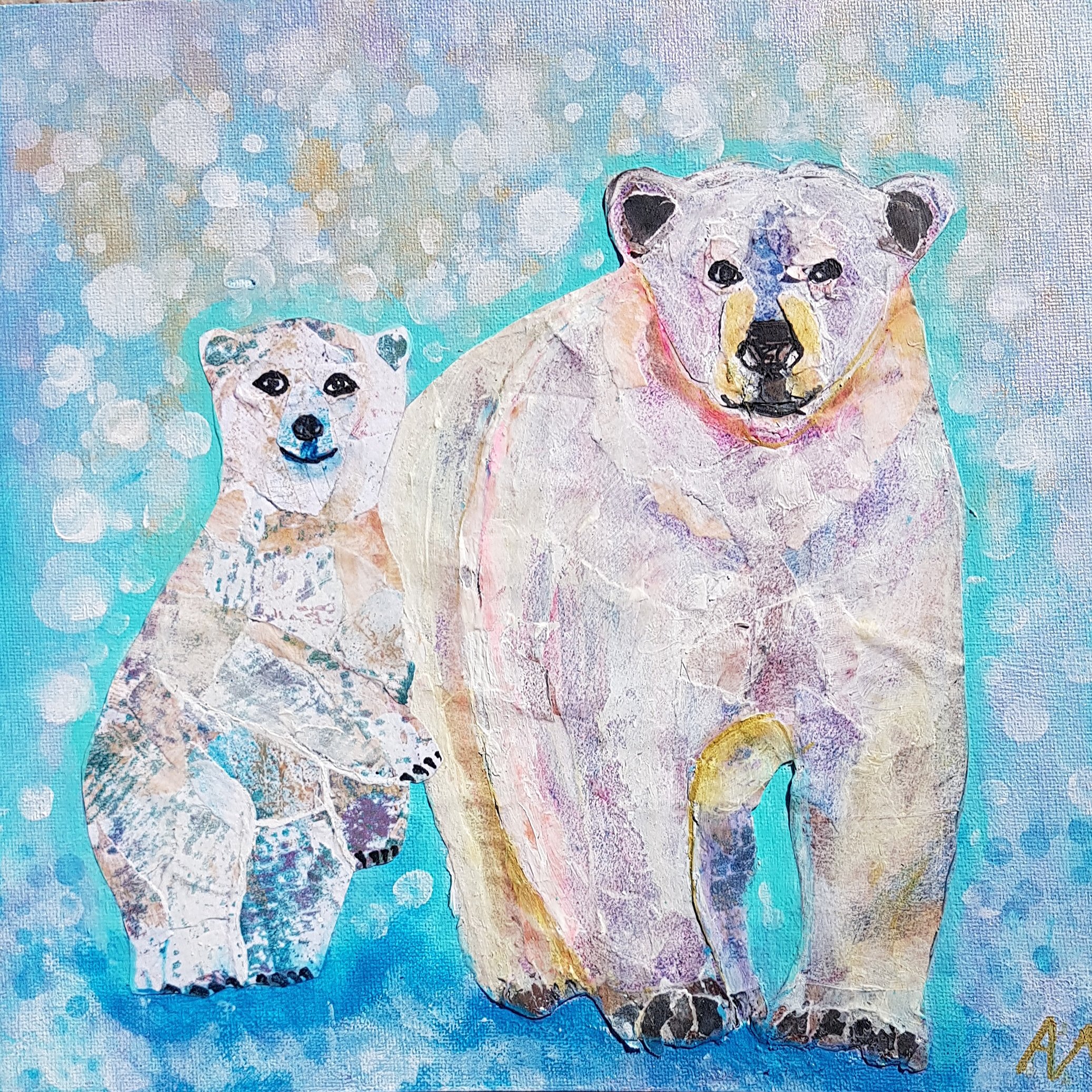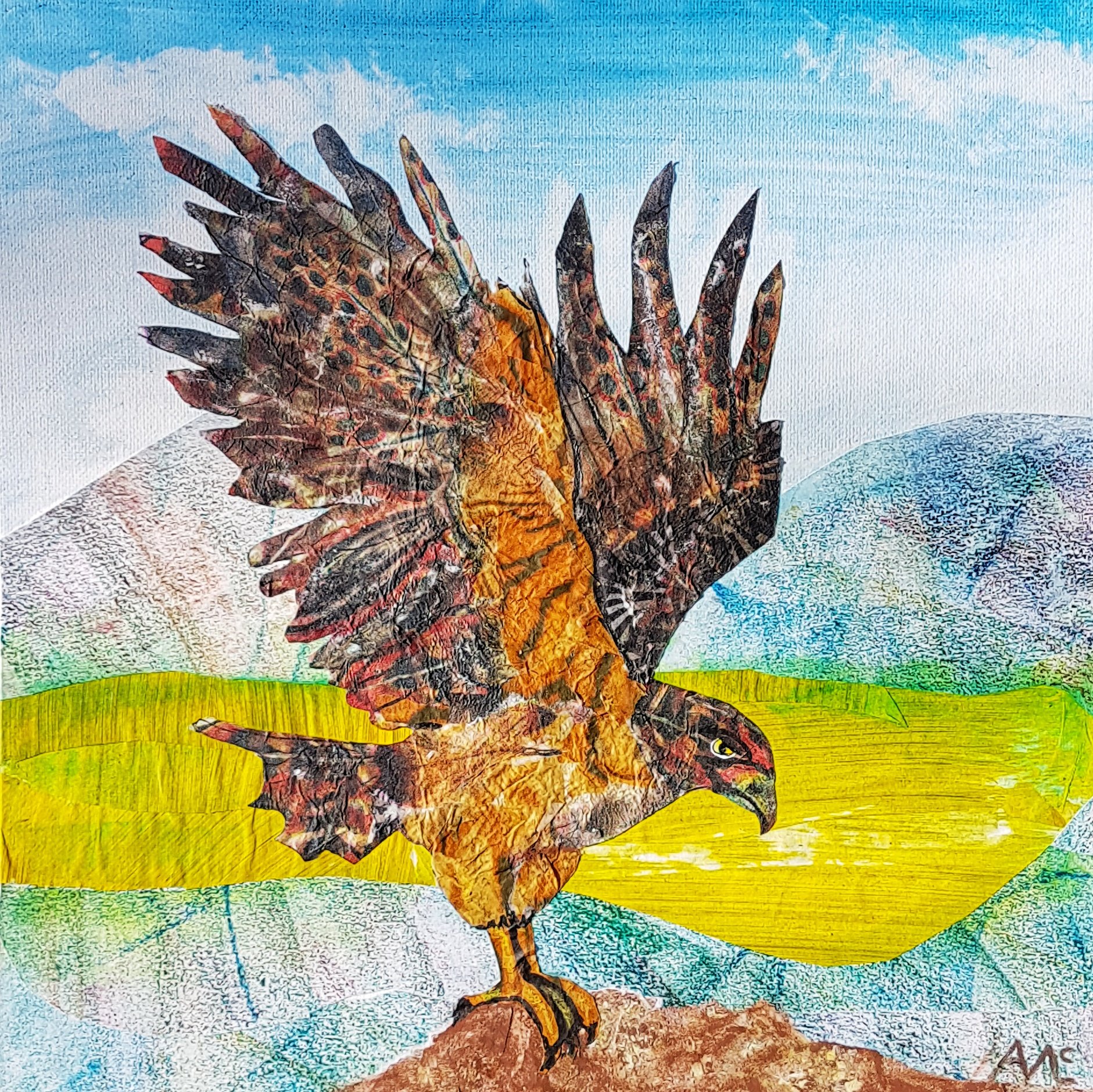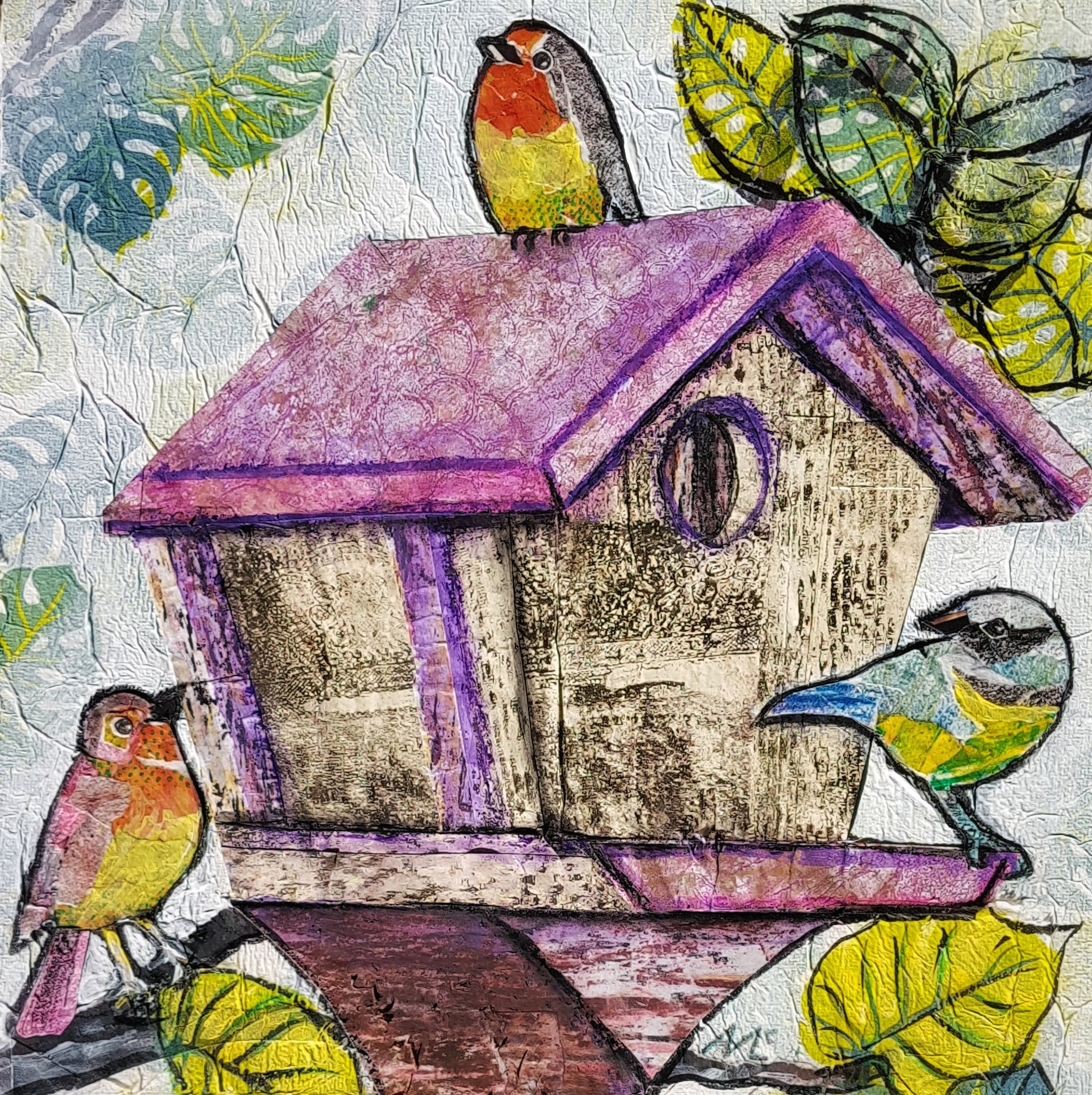 Collage and mixed media painting on MDF canvas board.